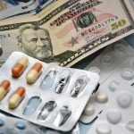 alt=”Opened bottle of beige pills on marbled surface, implement AI pharma”